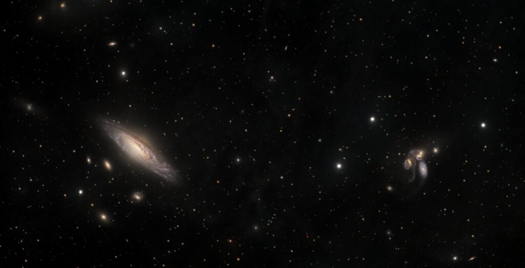 This region is affectionately called the Deer Lick Group. NGC 7331 is the “Salt Lick,” and the four tiny galaxies huddled around it are “The Fleas.” On the far right of the frame, you’ll see a separate, famous cluster: Stephan’s Quintet. While they look close together, they are just photobombing the scene. Stephan’s Quintet lies about 290 million light-years away, while NGC 7331 is “only” 40 million light-years distant. We are looking through a staggering 250 million light-years of intergalactic void between them.