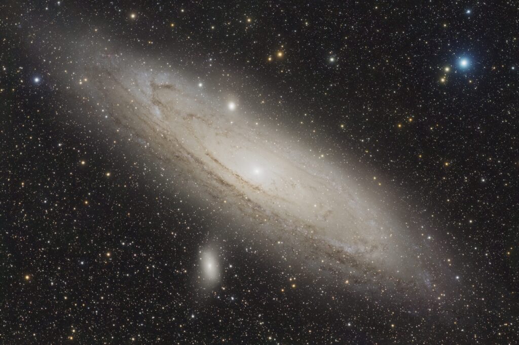 In the photo you can see how much real estate the object occupies in space, filling the entire field of view. The challenge with imaging this beauty is maintaining enough dynamic range to capture detail at the core and the faint nebulosity on the edge. I like the beautiful blue star in the corner, and you can also marvel at the satellite galaxy, a curious companion orbiting like a loyal little brother. I spent several nights under good skies capturing 20 hours of total exposures which significantly improves signal to noise ratio as you can see in the photo.