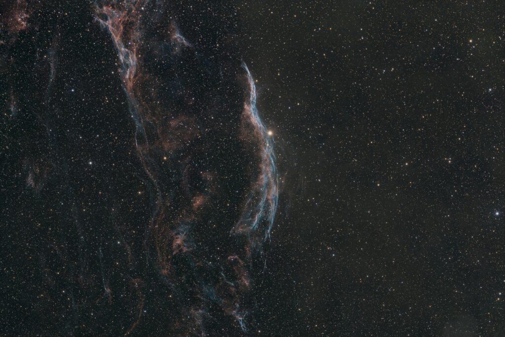 I love the gossamer filaments visible here. Unlike reflection nebulae that are lit by stars, these filaments glow due to massive shockwaves crashing into interstellar gas, ionizing it into the lovely blues and reds you see here. The bright star visible in the frame is 52 Cygni—a foreground star that isn’t actually part of the nebula but adds a beautiful anchor to the image.